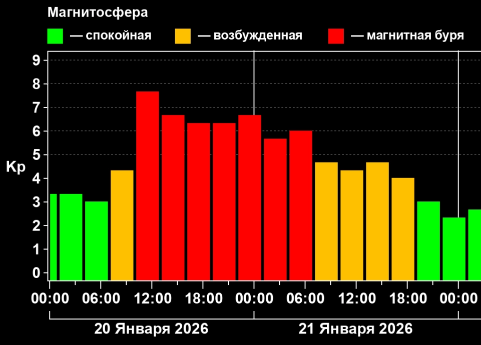 Геомагнитный индекс Kp в предстоящие двое суток поднимется до 7–8 баллов. Наиболее интенсивные возмущения ожидаются в ночь с 19 на 20 января и в первой половине дня 20 января, когда Kp достигнет 8 баллов. Это соответствует уровню G3—G4 по пятибалльной шкале бурь — сильная и очень сильная. Такие возмущения могут вызывать перебои в работе GPS и радиосвязи, а также спровоцировать головные боли, бессонницу и скачки давления у метеозависимых людей.
