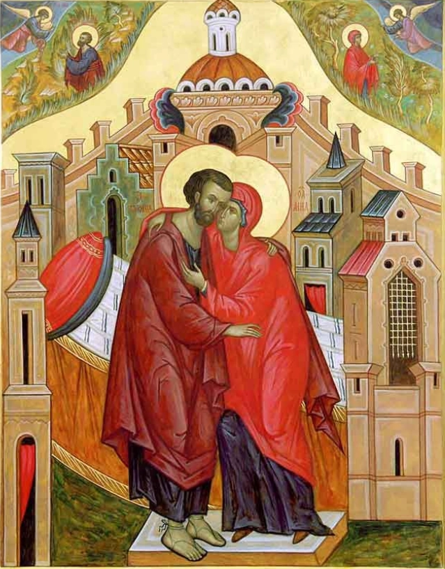 С тем же благовестием Ангел явился и праведному Иоакиму, повелев ему возвратиться в Иерусалим. Встретившись у Золотых врат, супруги с радостью и трепетом приняли весть о грядущем рождении Пресвятой Девы Марии.