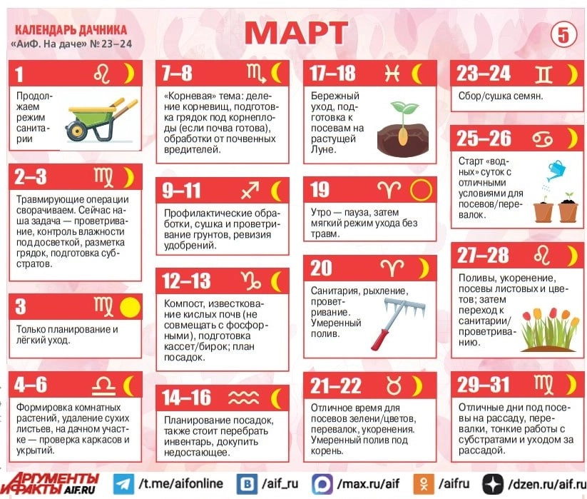 Лунный календарь для рассады на март 2026