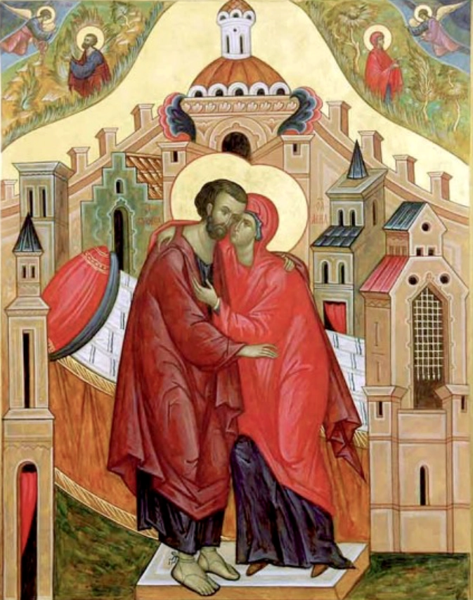 Ангельское благовестие было даровано и Иоакиму. Он вернулся в Иерусалим, где встретился с Анной у золотых ворот храма. Сие чудо укрепило веру супругов и принесло несказанную радость, ибо они узнали, что Пречистая Дева Мария, будущая Мать Спасителя, уже зачата по милости Божией.