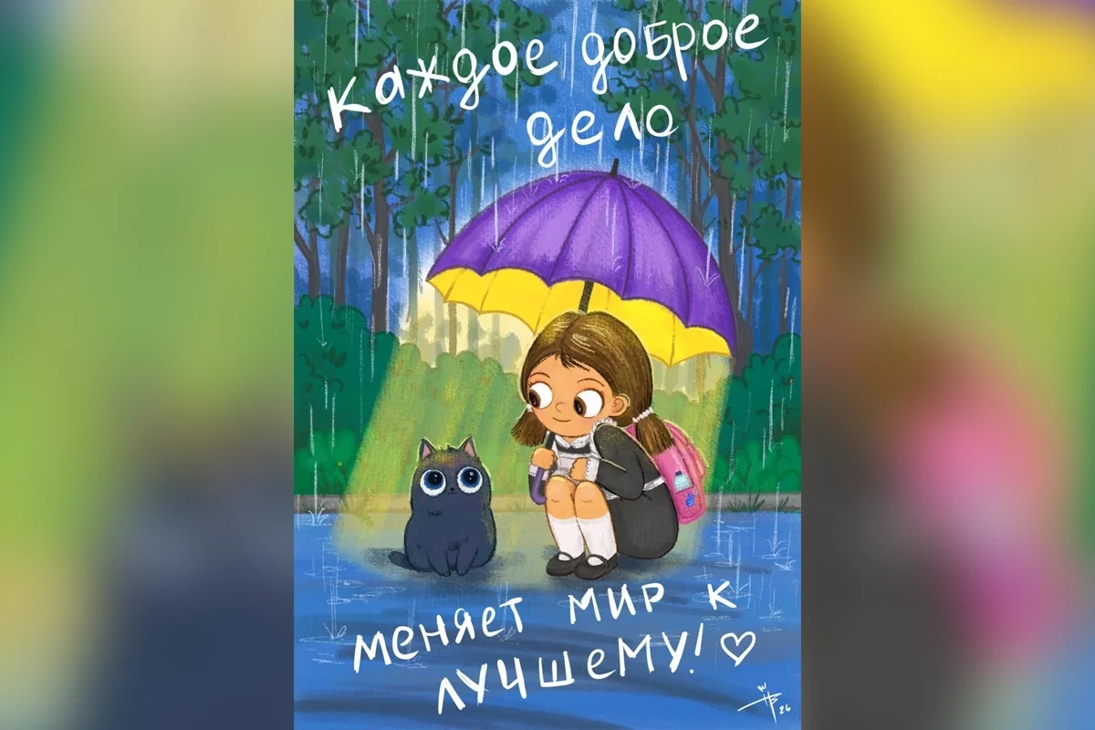 Среди победителей — комсомольчанка Варвара Петраш. Её работа «Каждое доброе дело меняет мир к лучшему!» признана одной из лучших в номинации «Важное — детям». Плакат выполнен в простой и понятной форме — на нём девочка делится зонтом с котёнком, и эта сцена превращается в цепочку добрых поступков.