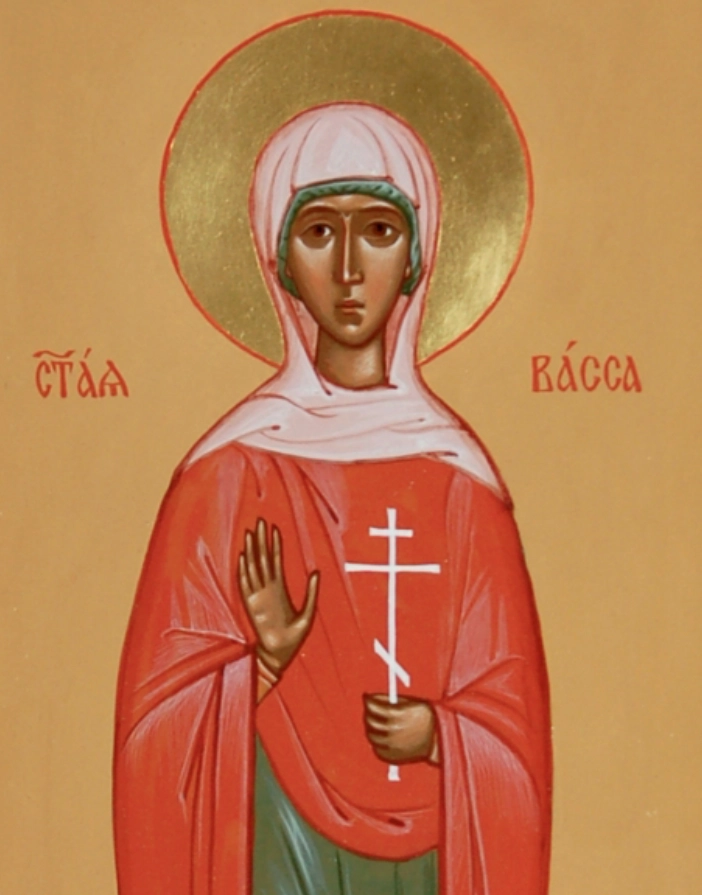 Святая Васса родилась в знатной семье в городе Едесса Македонская в начале IV века, в эпоху, когда христианство подвергалось гонениям, а император Максимиан издавал жестокие законы о принесении жертвы языческим богам. Её родители воспитали девочку в вере Христовой, прививая любовь к Богу и стремление к праведной жизни. Воспитание в страхе Божием и изучение Священного Писания с ранних лет сделали Вассу стойкой и рассудительной девушкой, готовой к служению Господу.