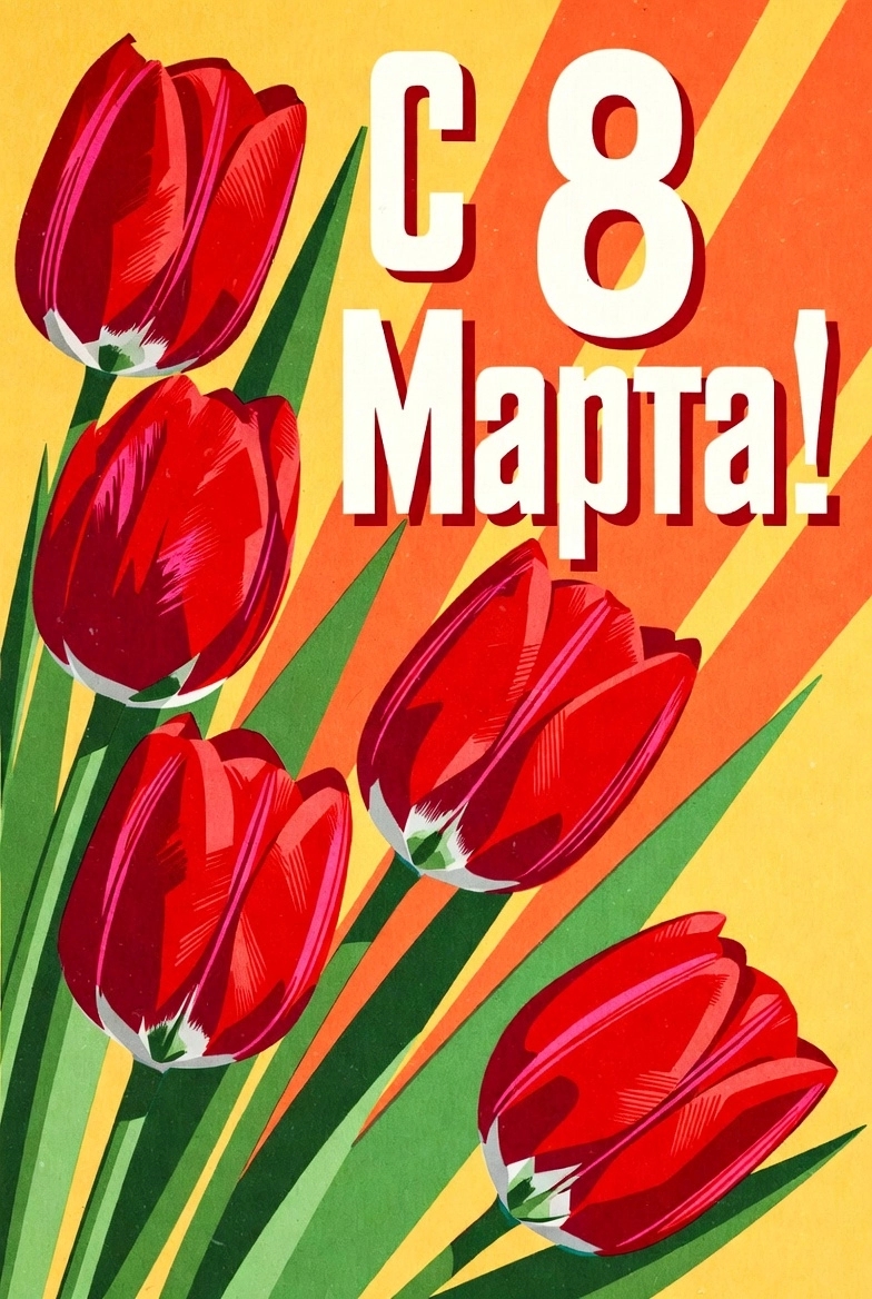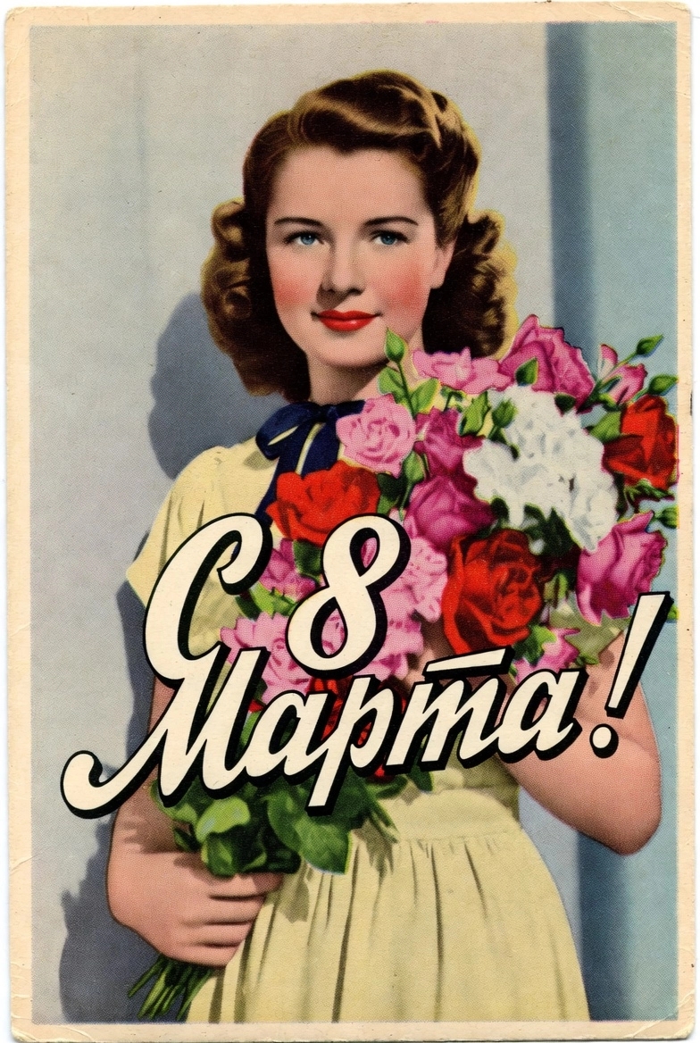 Популярны были и практичные презенты: наборы алюминиевых кастрюль, сковородки, электрические утюги или чайники, дефицитные колготки, отрезы ткани на платье, хрустальные вазы или бигуди. Косметика, мыло в подарочной упаковке, мягкие игрушки для девочек и книги тоже входили в традиционный набор. Даже обычный фартук или прихватки могли вызвать искреннюю радость, потому что это были вещи, облегчавшие тяжелый быт. Конечно же, открытки женщинам к 8 Марта тоже дарили — здесь художники часто отступали от плакатных шрифтов и позволяли себе более нежные, пастельные тона, мягкие надписи и лёгкие композиции. Но главным оставалось внимание — мужчины стремились удивить близких, несмотря на все трудности.