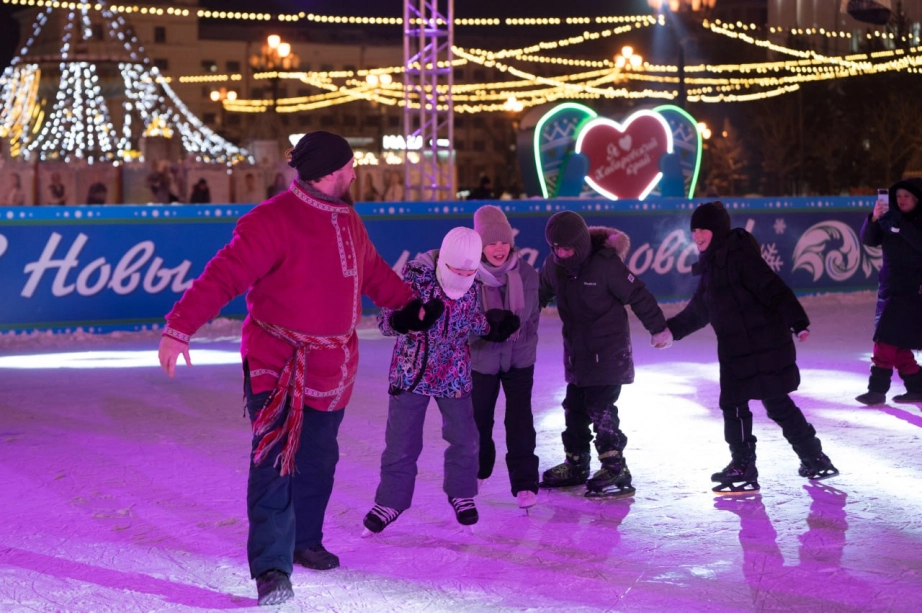 Центр новогоднего волшебства в Хабаровске — это, конечно, площадь имени Ленина. Здесь сверкает главная елка края, работает каток под веселую музыку, а по периметру выстраиваются домики фестиваля-ярмарки "Амурфест.Зима", где гостям предлагают горячий чай и сувениры. Со 2 января 2026 года на площади начинается насыщенная программа бесплатных уличных мероприятий: ежедневно с 13:00 до 16:00 проходят игры, эстафеты и весёлые старты, а также организуются интерактивные площадки. Пространство ориентировано на семейный отдых — дети играют с ростовыми куклами, взрослые подключаются к викторинам и соревнованиям, а праздничная атмосфера сопровождает события на протяжении всего дня.