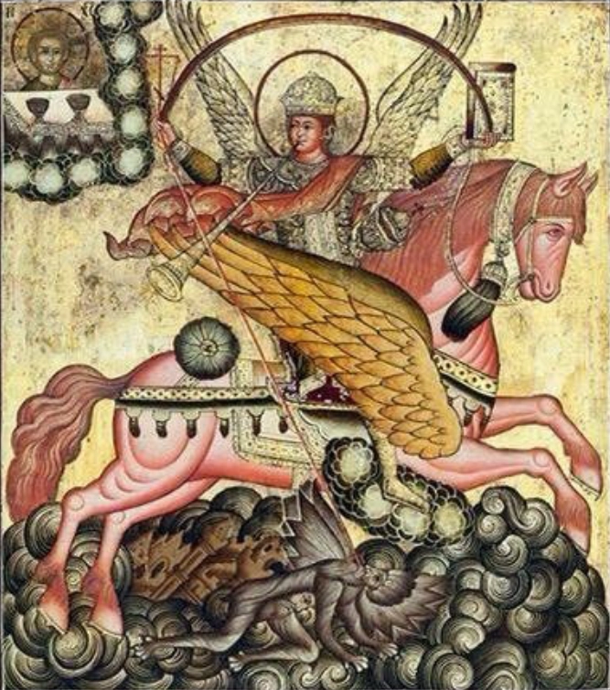 На иконах Архангел Михаил изображается с огненным мечом или копьем, низвергающим диавола. Его образ символизирует духовную силу, правосудие и защиту, служа примером веры и мужества для всех христиан. Праздник Собора святых Ангелов, установленный в IV веке, подчеркивает значимость Михаила как предводителя небесного воинства.