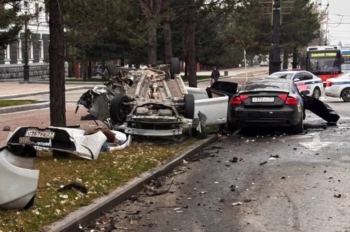 В Хабаровске сегодня около пяти утра на перекрёстке улиц Карла Маркса и Дикопольцева водитель Audi A5 на высокой скорости выехал на красный свет и врезался в Toyota Caldina, сообщает телеграм-канал Госавтоинспекция Хабаровского края.
