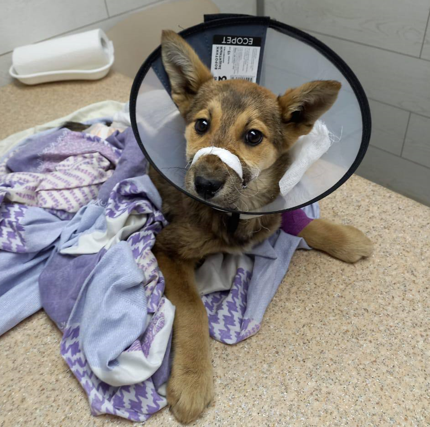 «Долгое время щенок прятался в трубах и не выходил. Мы не могли поймать его две недели. Затем он вышел сам — это оказалась девочка, которая из-за ран не наступала на лапу», — поделилась Анастасия.