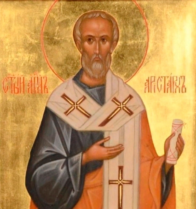Апостол Аристарх происходил из македонского города Фессалоники. Он стал ближайшим спутником святого апостола Павла и сопровождал его в миссионерских путешествиях. Когда в Ефесе поднялось мятежное возмущение против христиан, Аристарх вместе с другими учениками подвергся опасности и был схвачен разъярённой толпой, но не устрашился и остался верен своему служению. Он также сопровождал апостола Павла в его пути в Рим, разделяя с ним скорби, заключение и труды проповеди. В посланиях апостола Павла Аристарх назван «сотрудником» и «спленником», что свидетельствует о его полной преданности делу Христову.