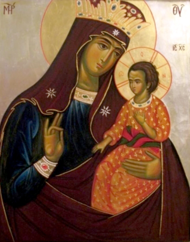 На левой руке Богородицы сидит Богомладенец Иисус Христос, изображённый как младенец с взрослым выражением лица — типичная черта византийской иконографии, подчёркивающая Его божественную природу. Он одет в золотисто-охристый хитон с звёздчатым орнаментом, символизирующим божественный свет и славу. В правой руке Младенец делает благословляющий жест двумя перстами, что обозначает Его как Спасителя и Учителя. Левая рука Богомладенца часто изображена прижатой к груди Богородицы или держащей край её одежды. Правая рука Богоматери поднята в благословляющем жесте — два перста сложены для благословения, а большой палец касается безымянного, что является православным символом Троицы и Христа как Альфы и Омеги. Фон иконы золотой, с нимбами вокруг голов: нимб Богородицы круглый с крестом или звёздами, нимб Христа — крестчатый.